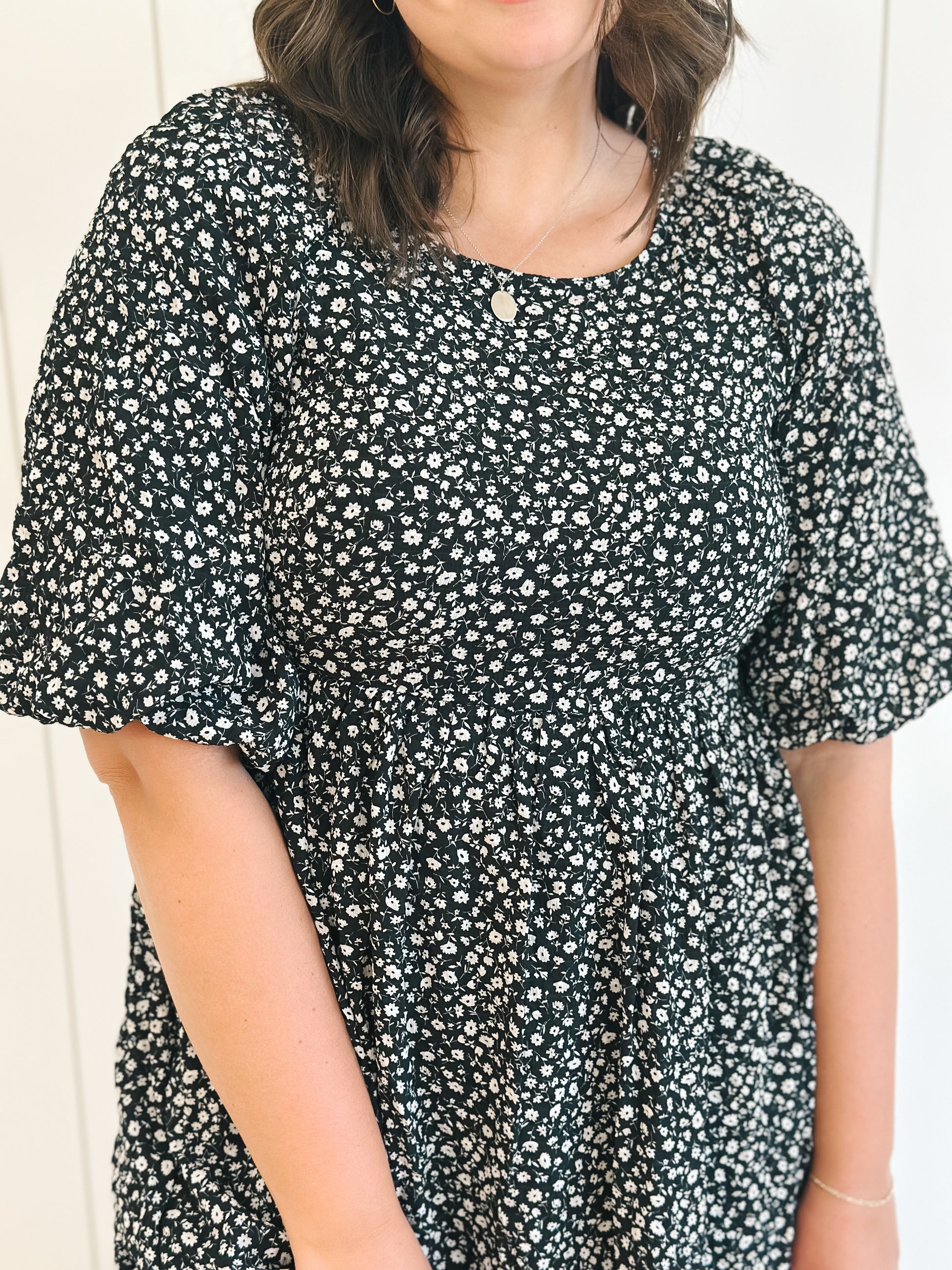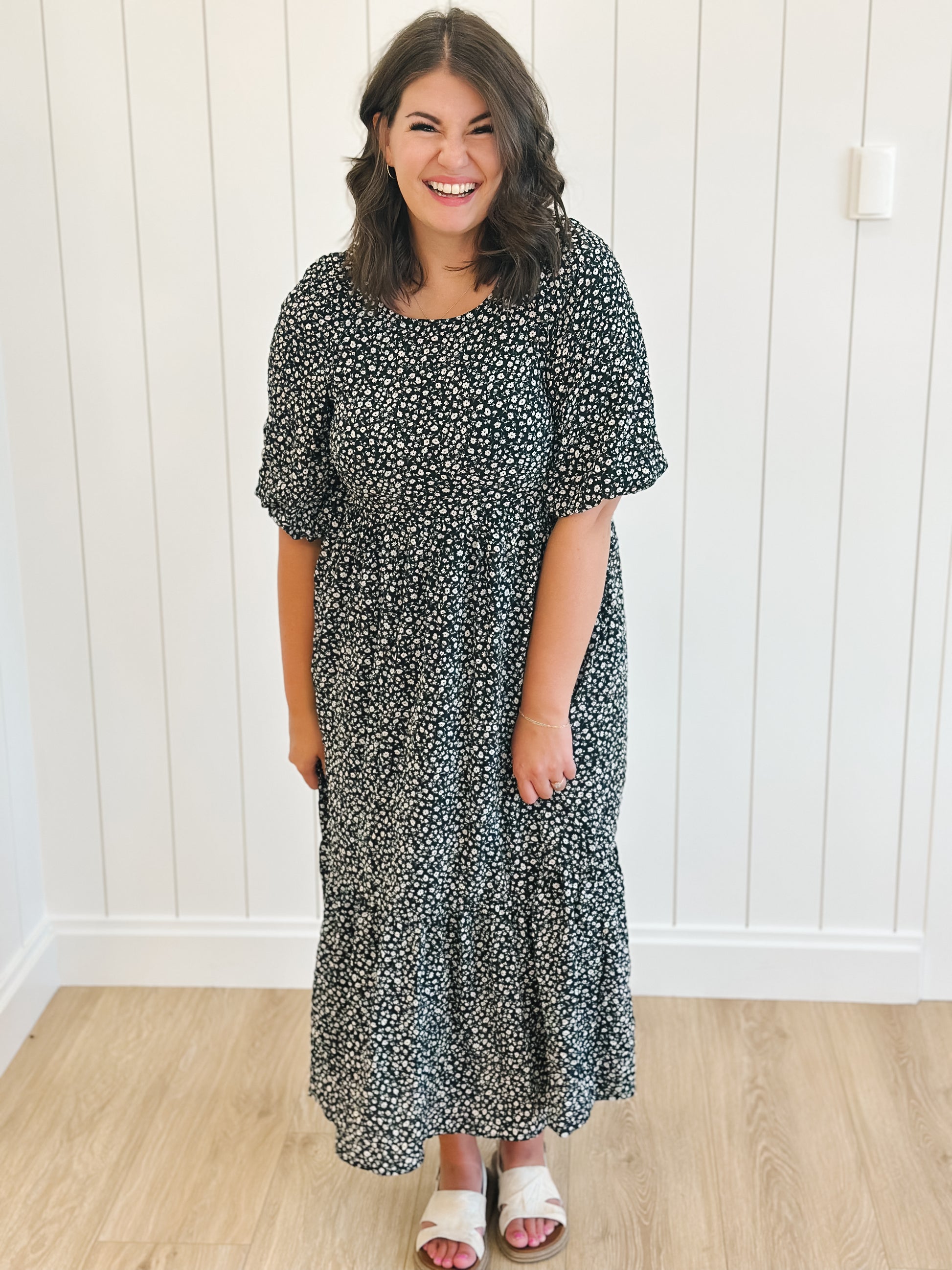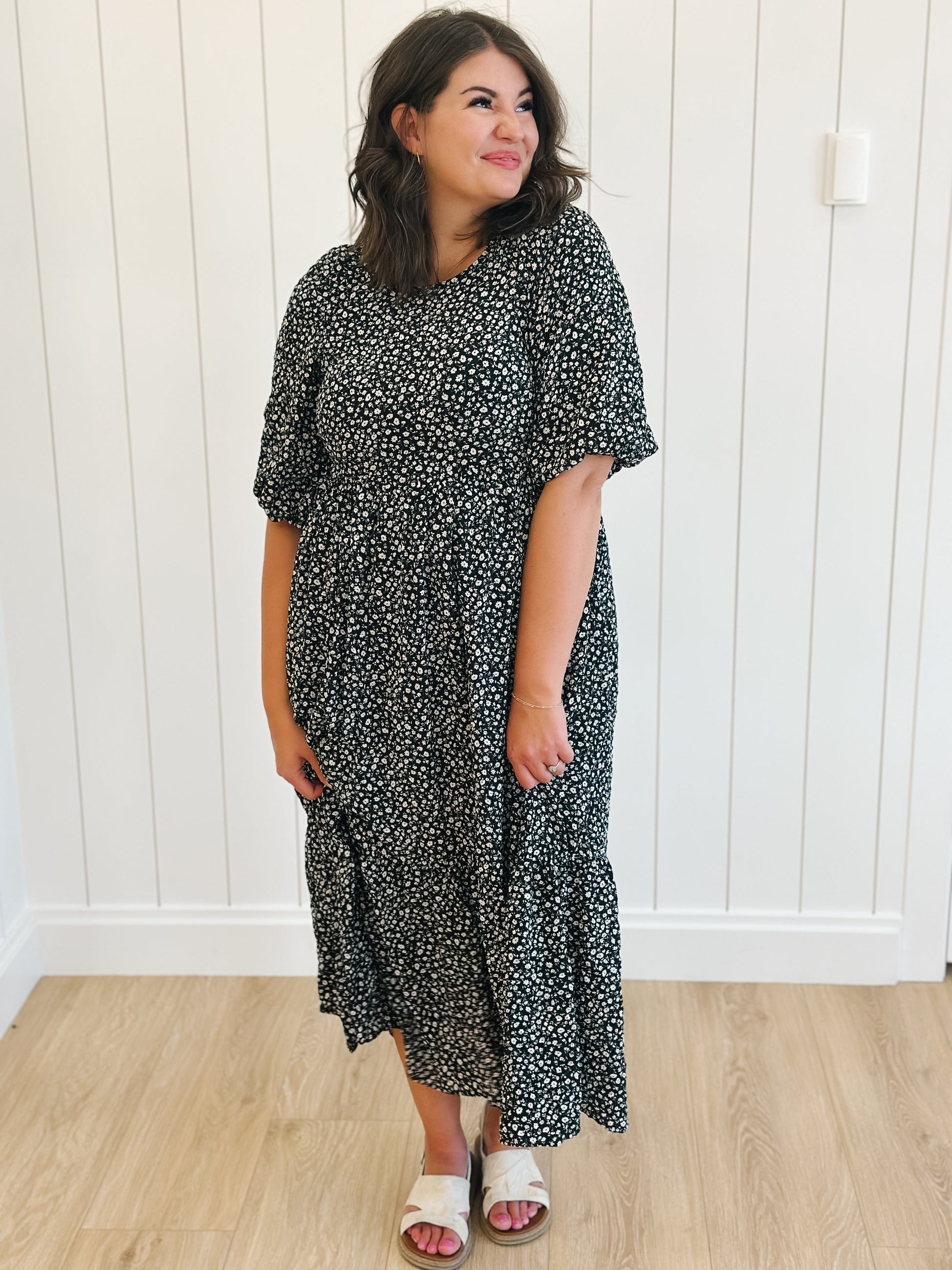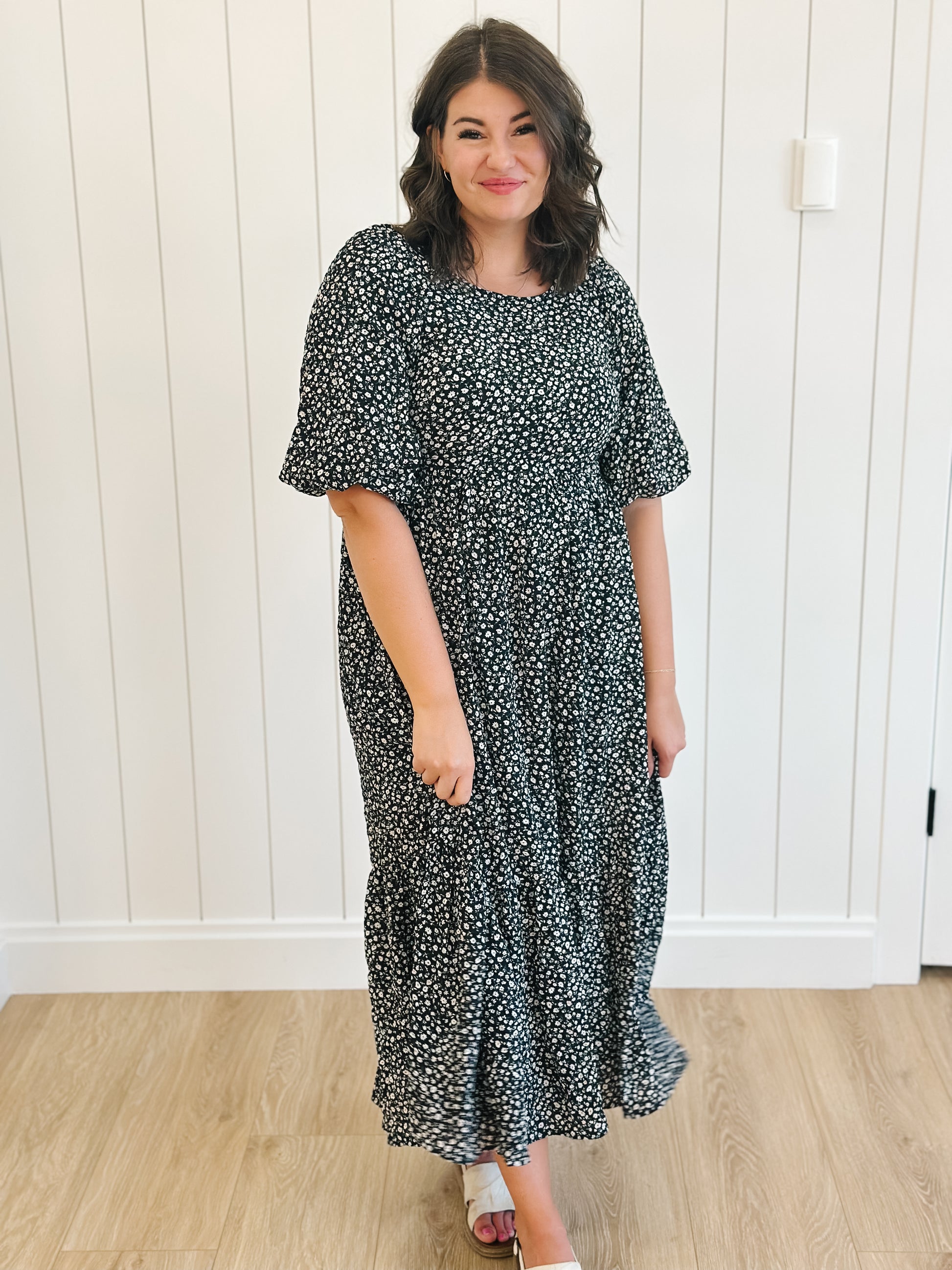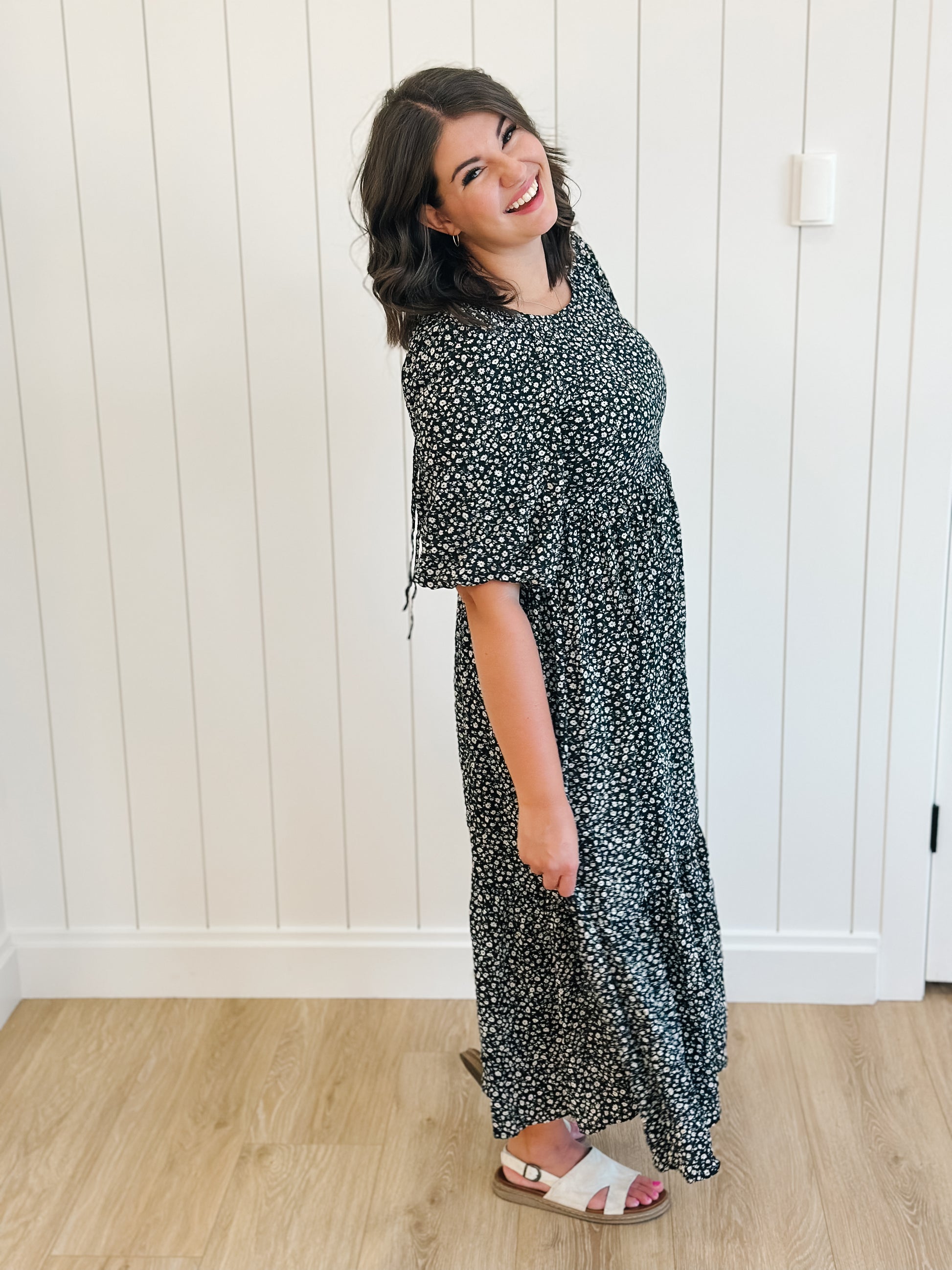 Ditzy floral maxi dress with bubble sleeves, hidden side zipper and is fully lined.