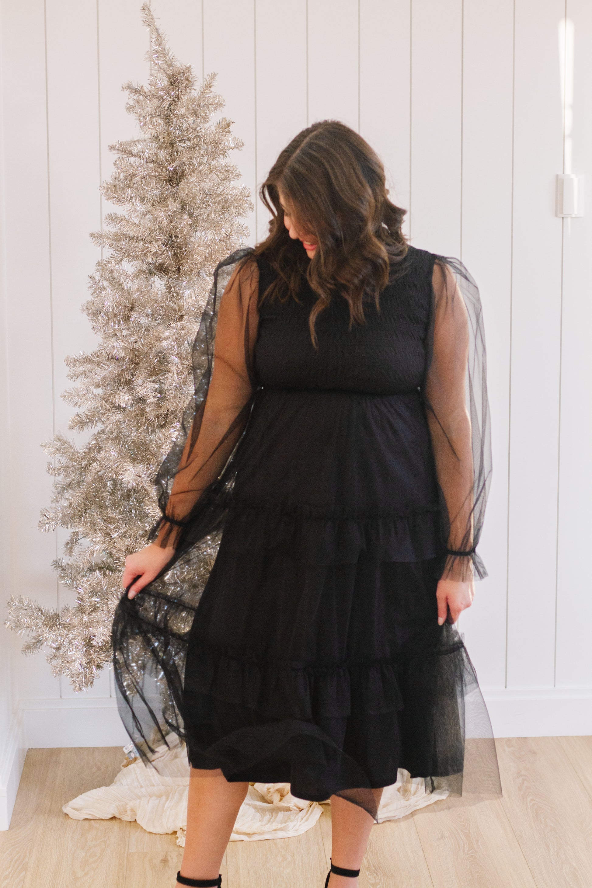 Tulle dress with sheer sleeves, tiered skirt, and a smocked bodice. Also has a keyhole closure