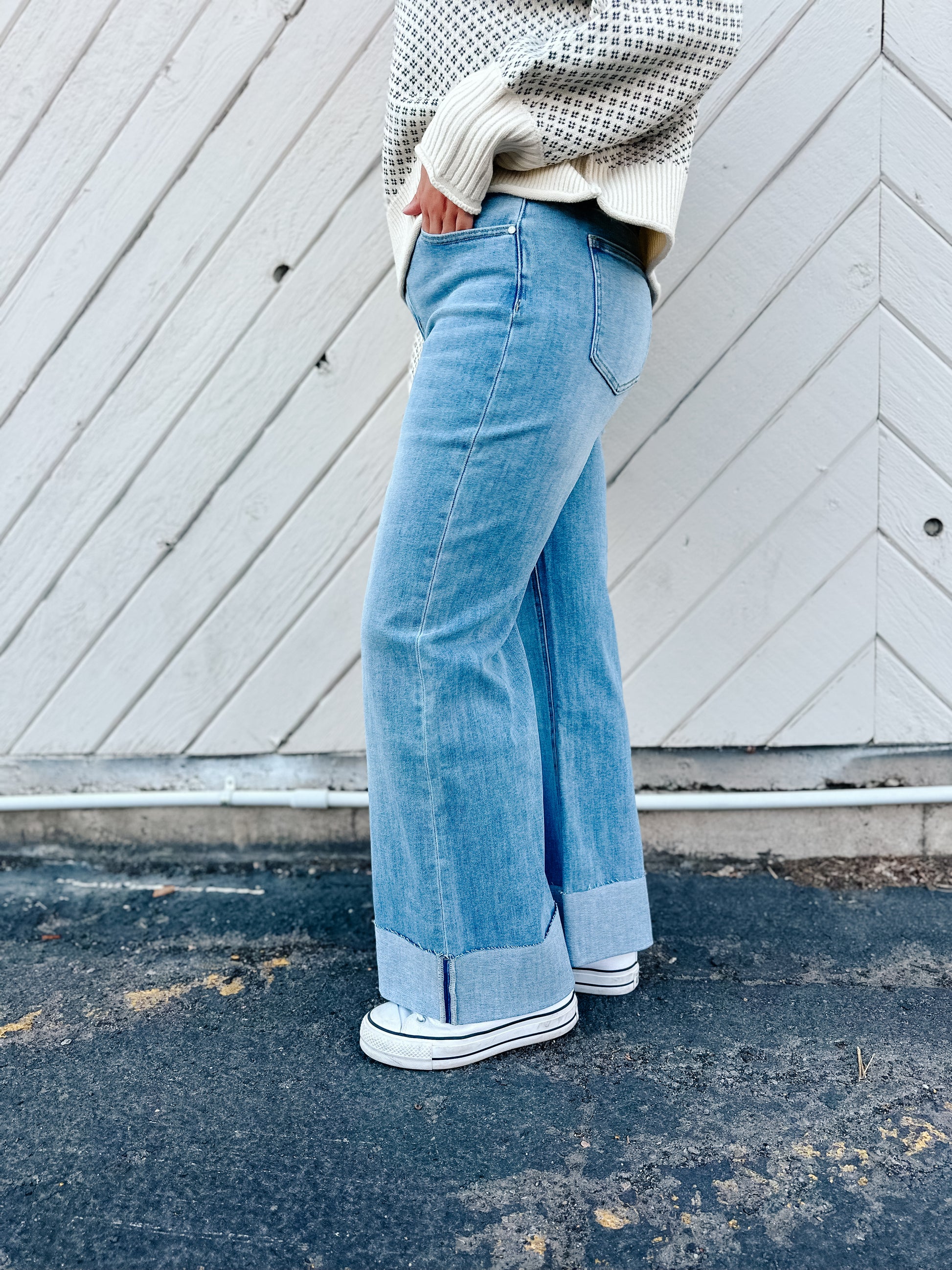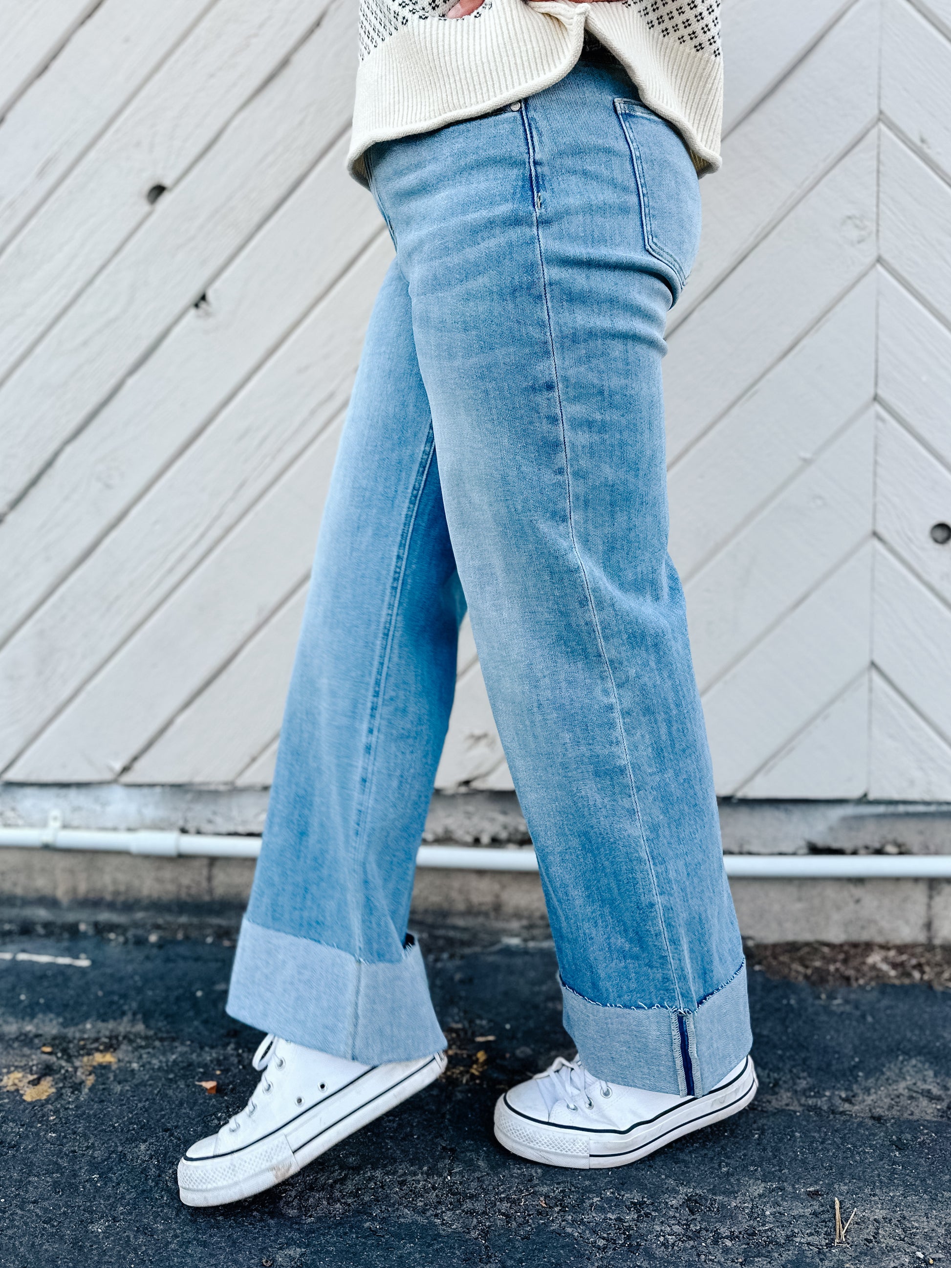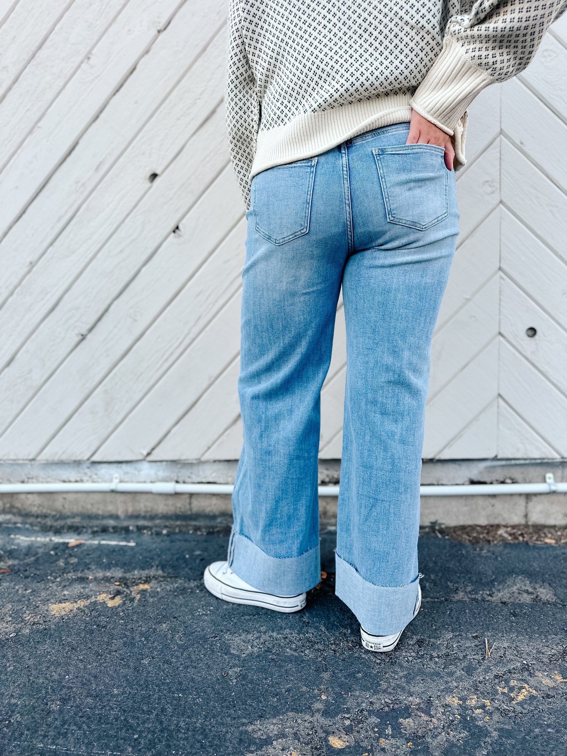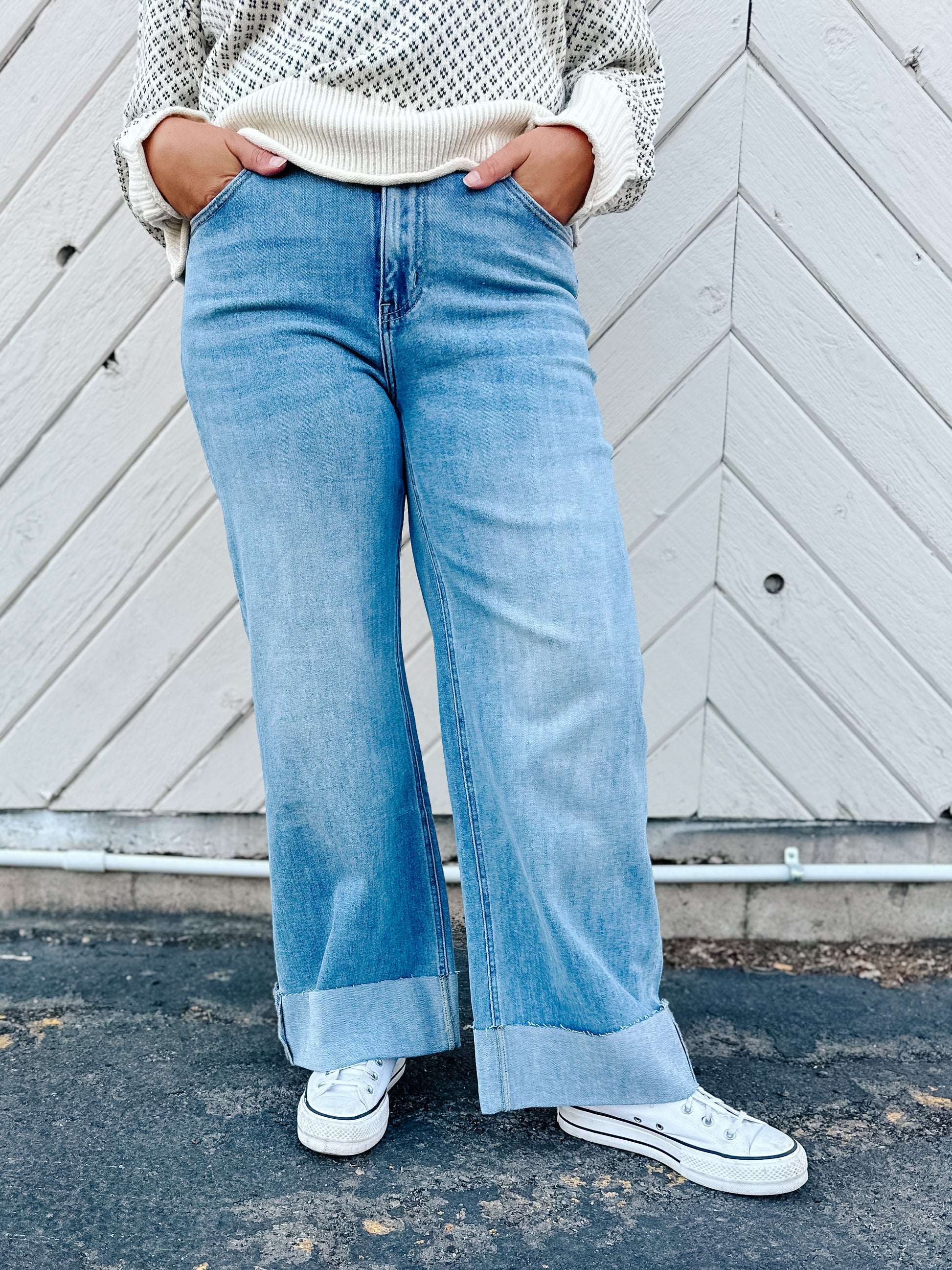 90s style jeans with a cuffed hem, high rise, and straight leg cut