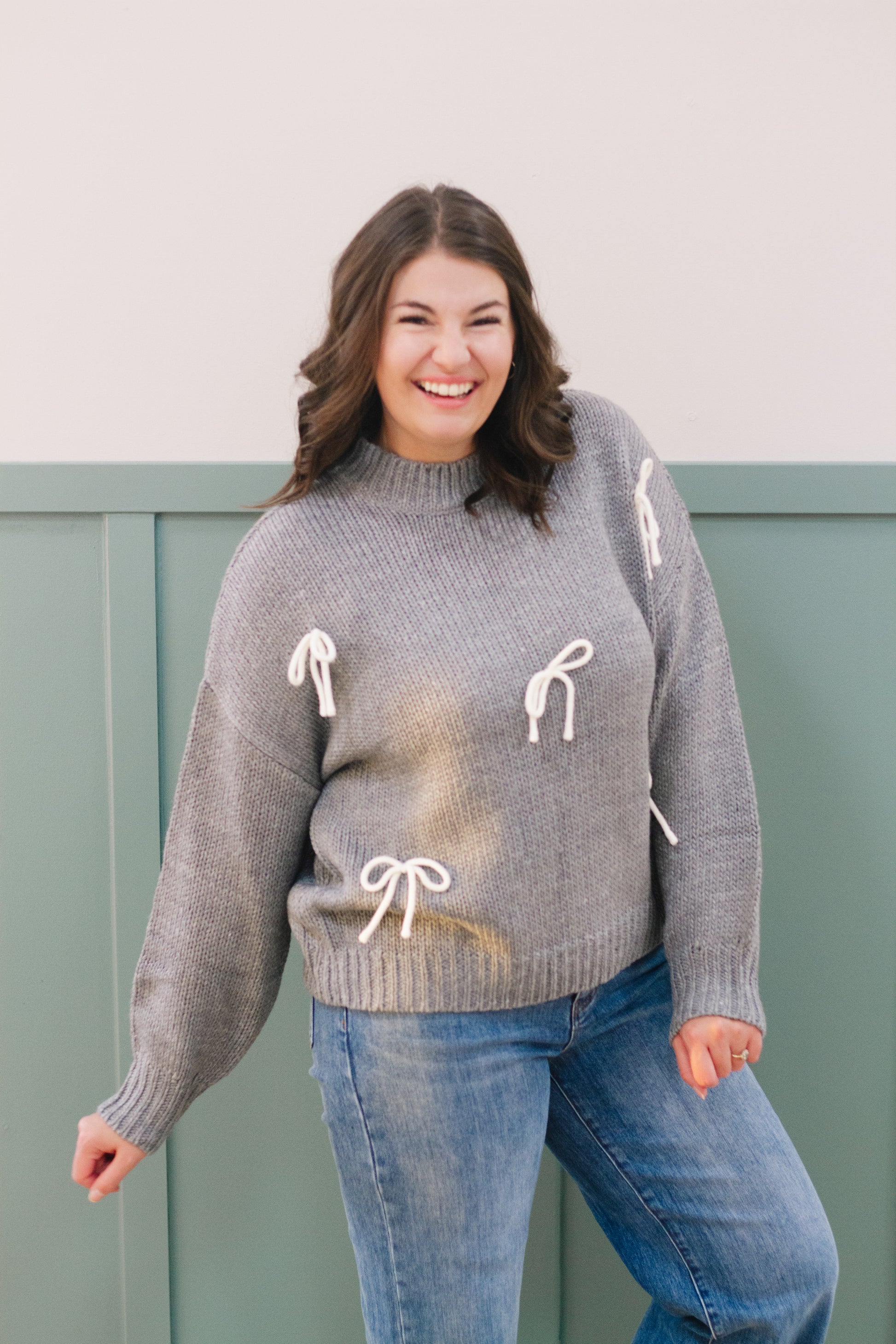 Soft knit sweater with a drop shoulder, relaxed fit and yarn bow details