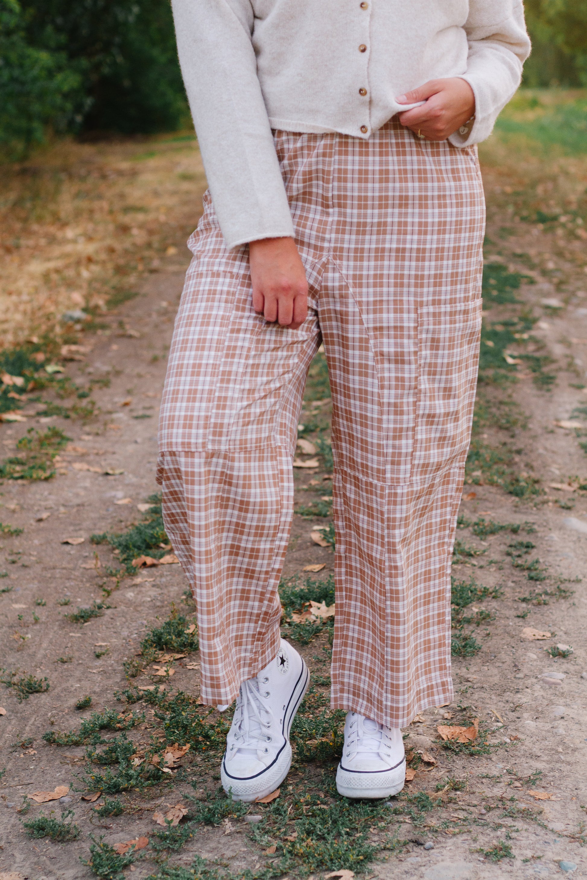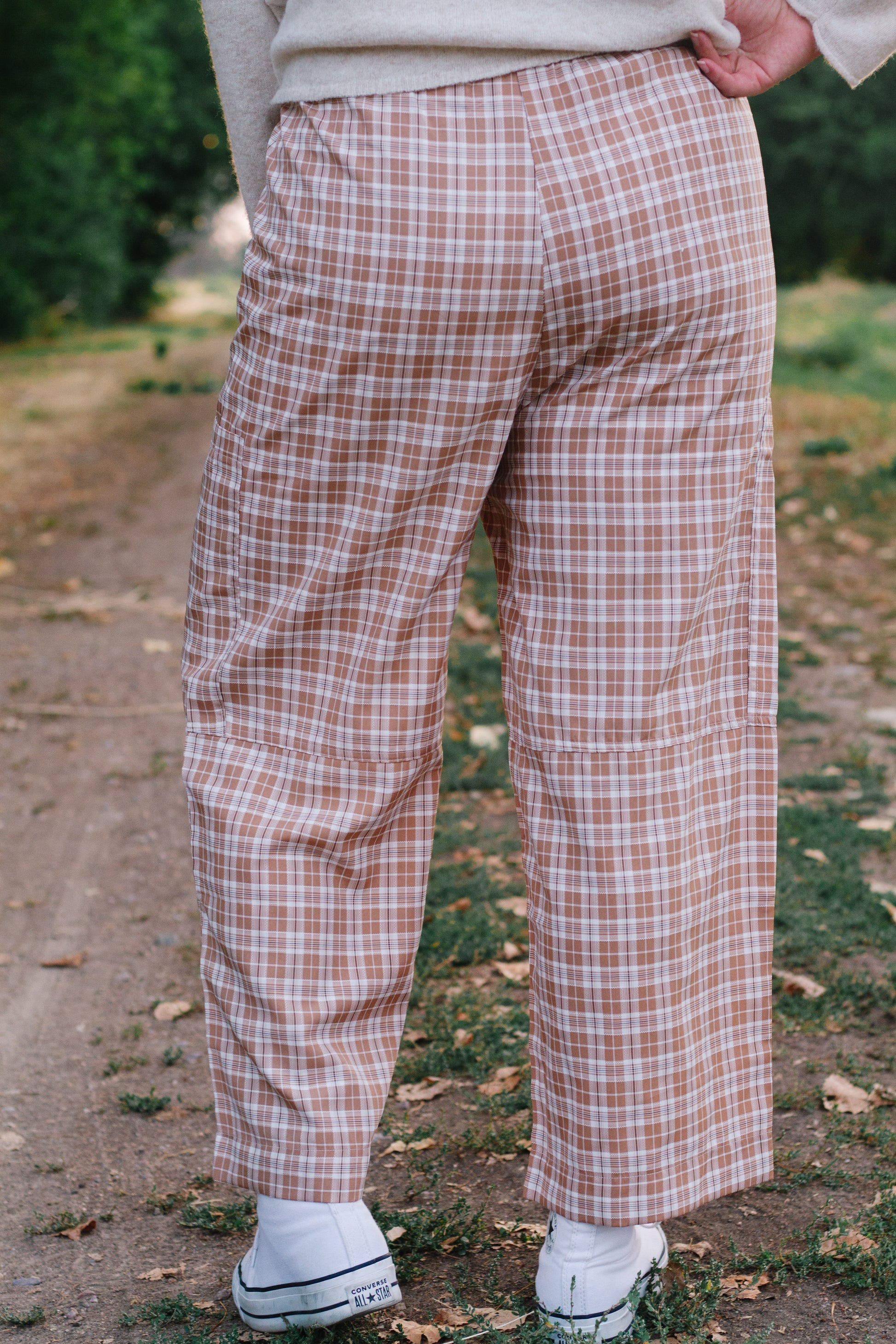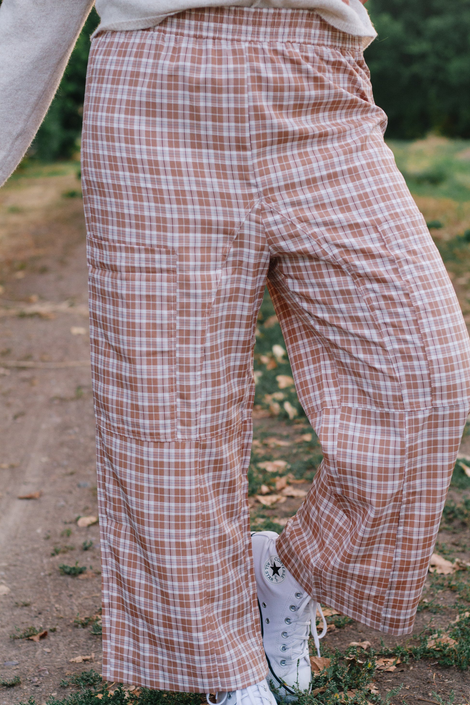 Featuring an elastic waist + patch pockets in a mocha plaid print.