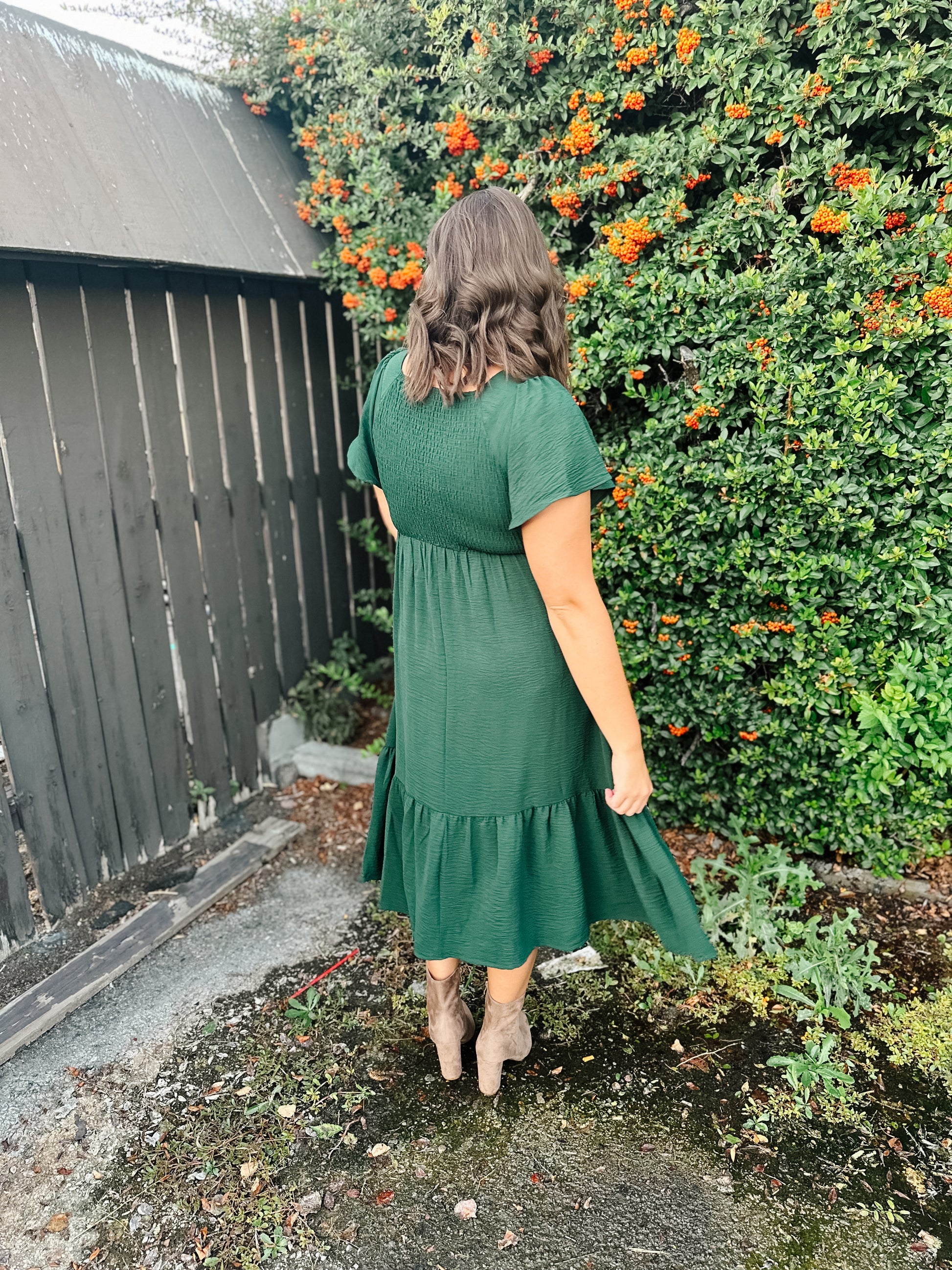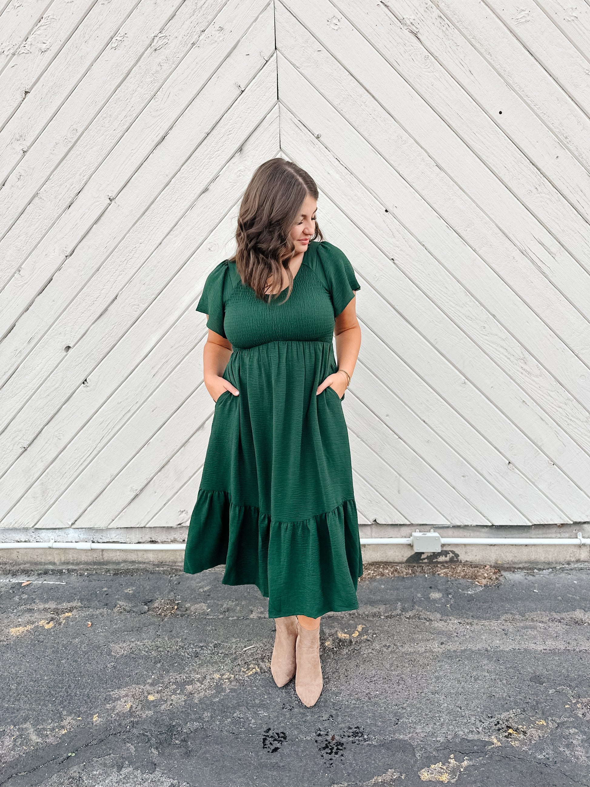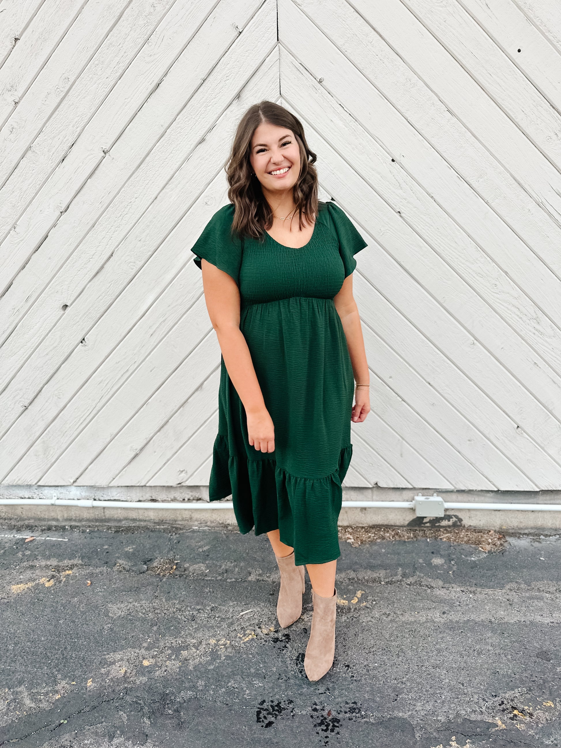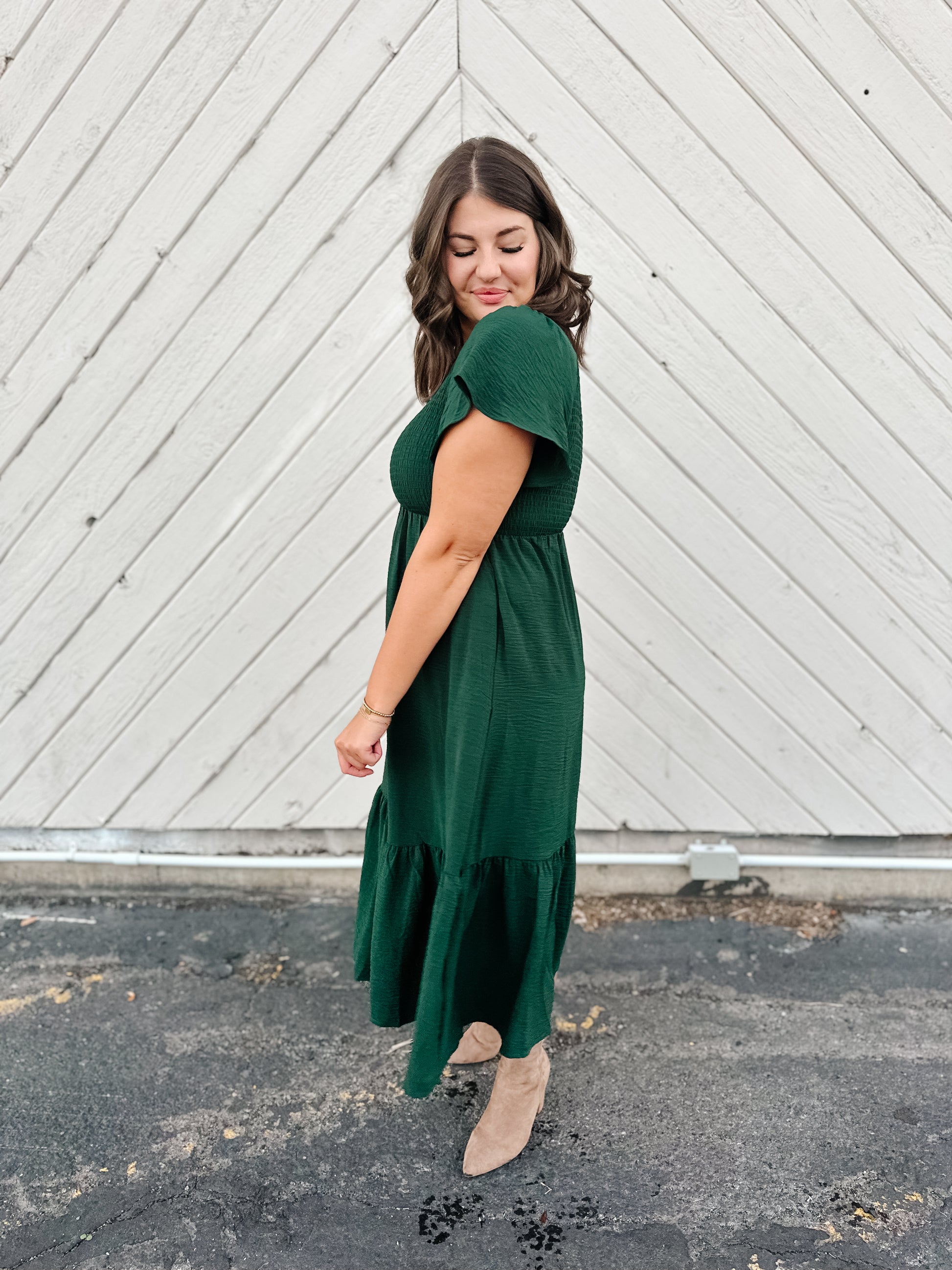 Maxi length dress with a ruffled hem, smocked bodice and flutter sleeves.
