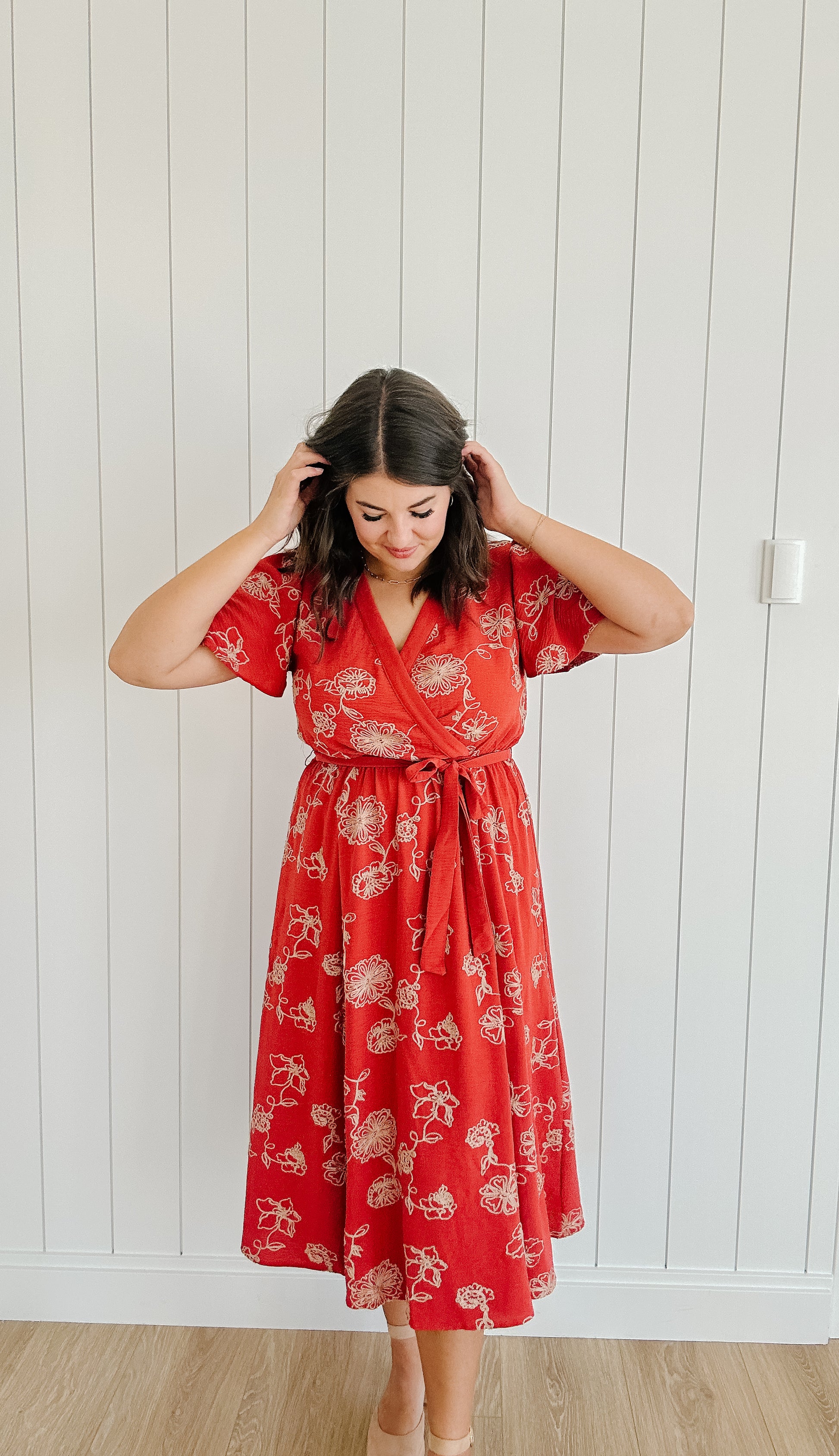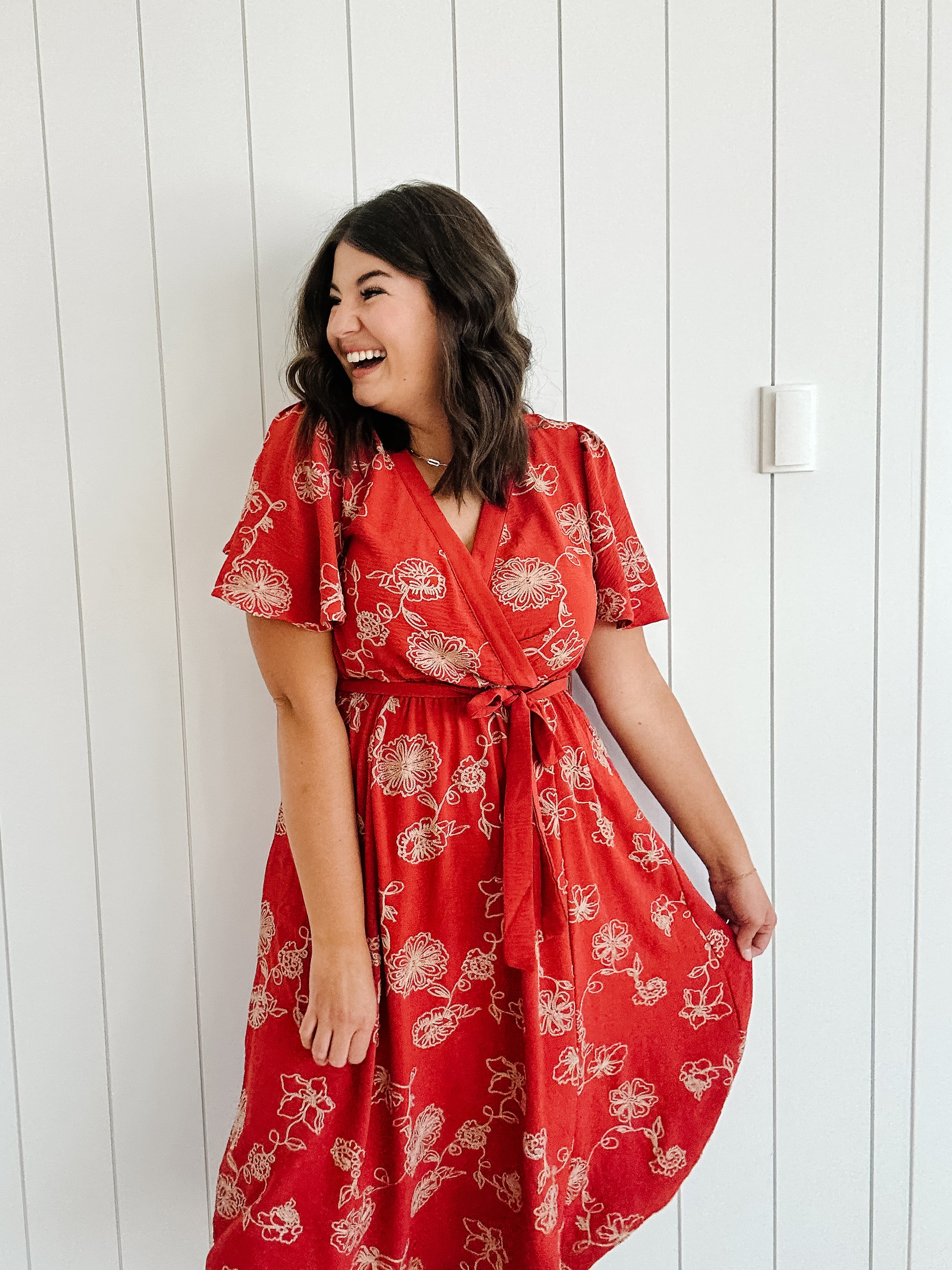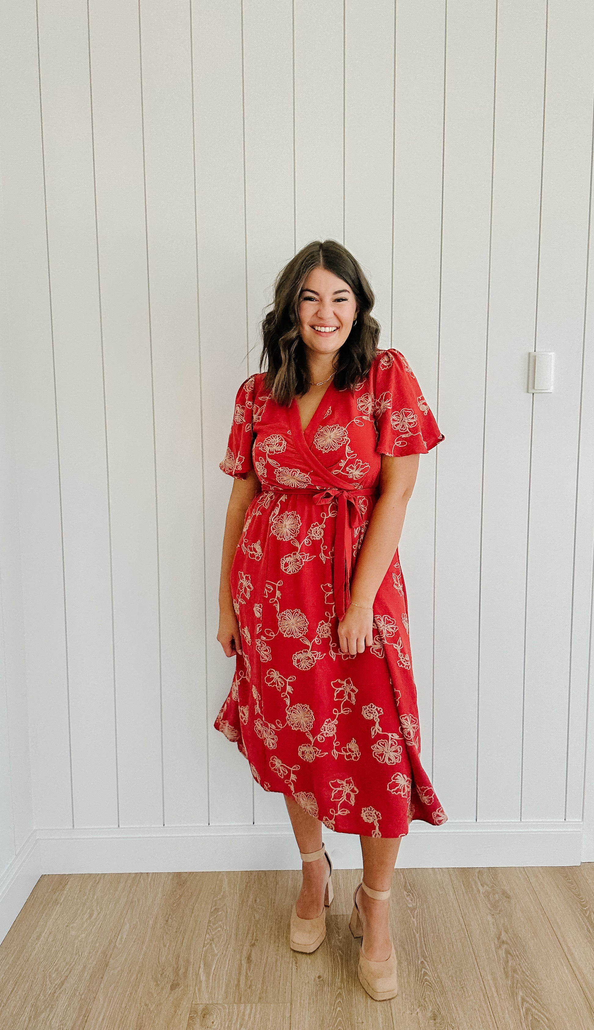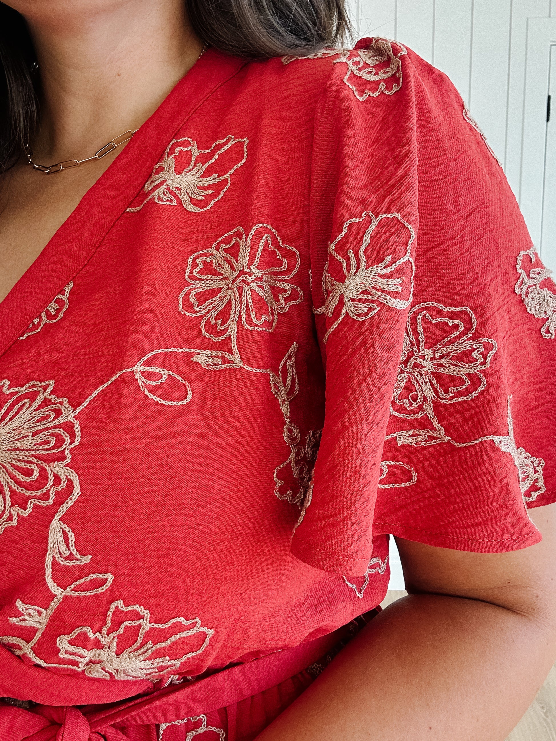 Beautiful embroidery on a v neck wrap top with flutter sleeves and a tie waist