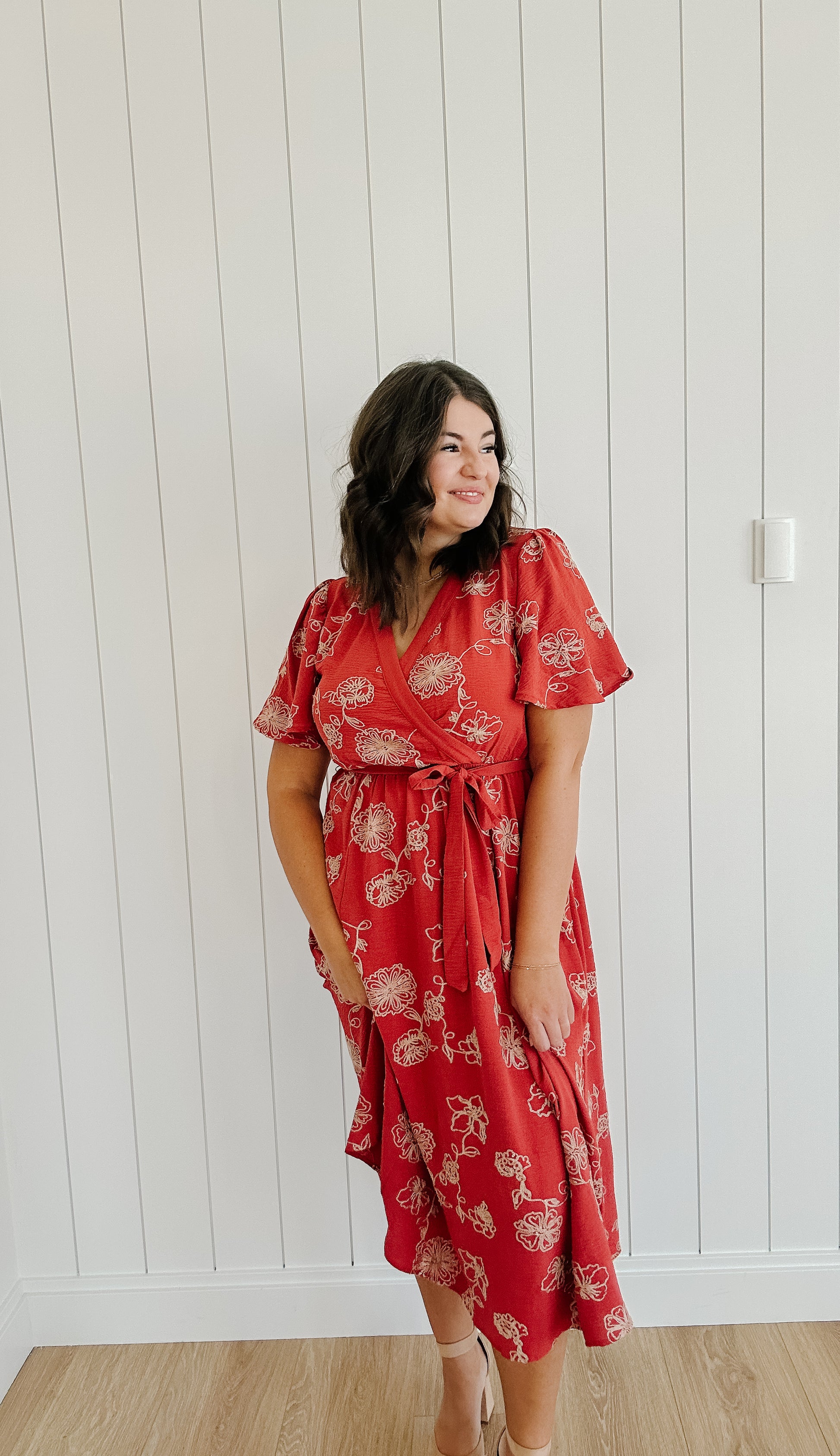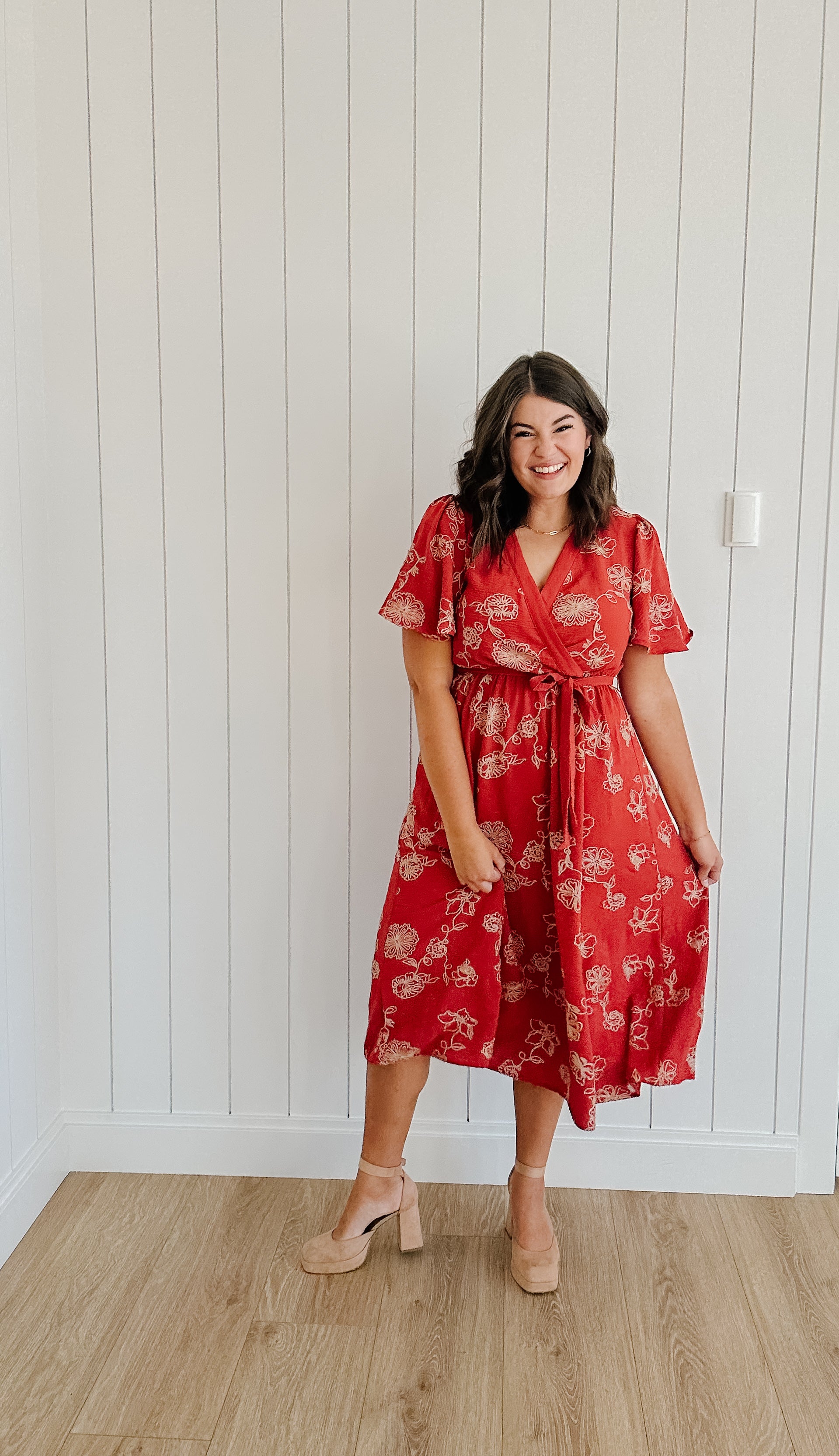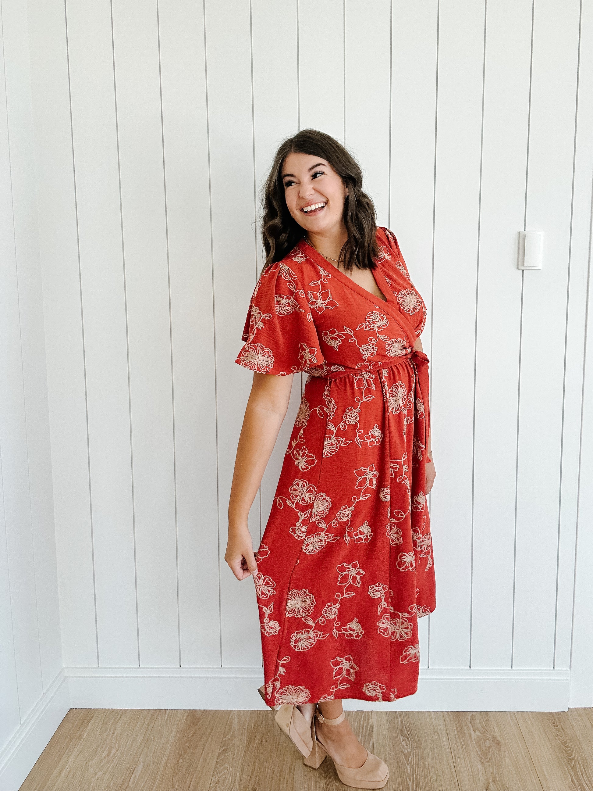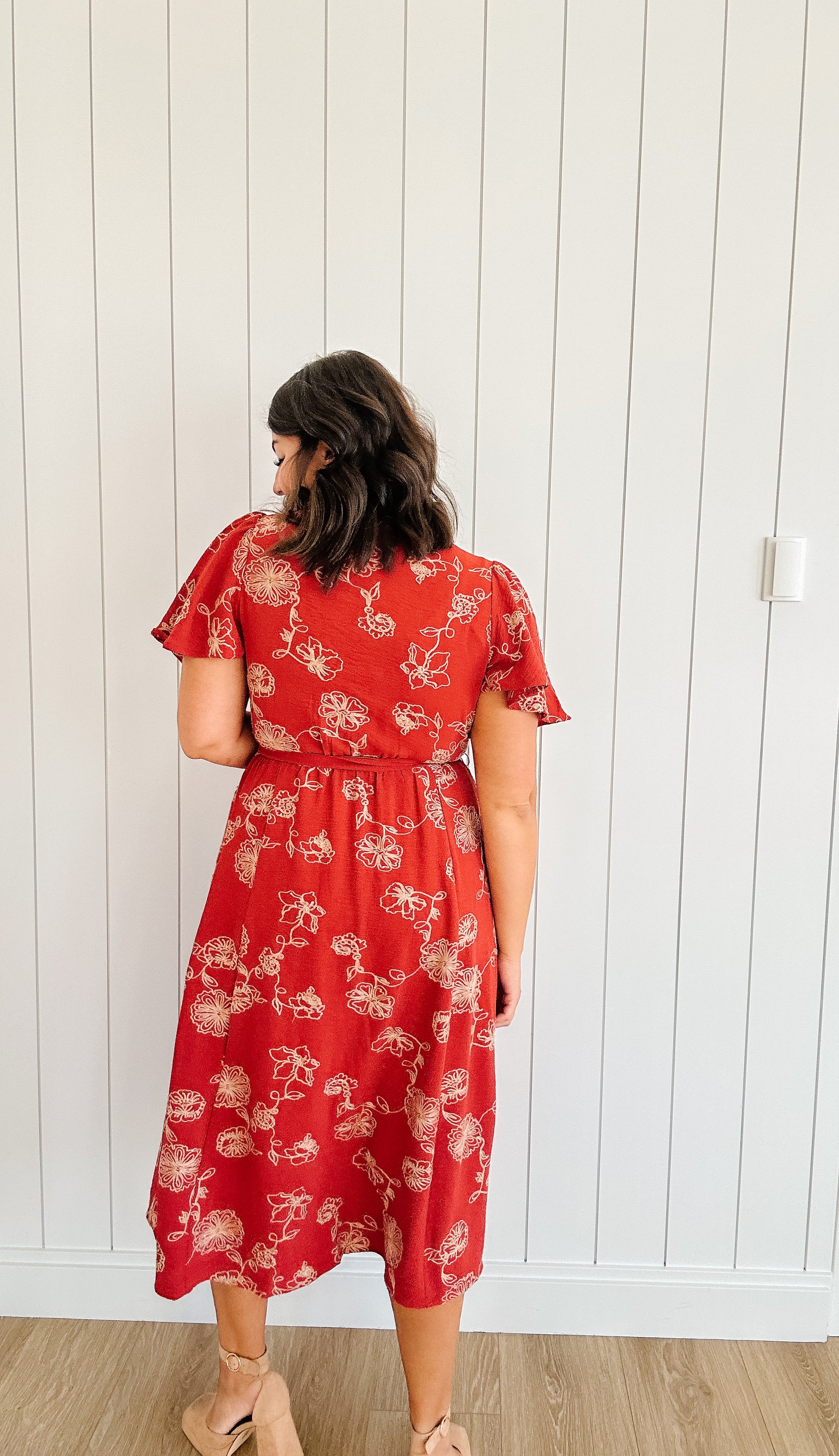 Beautiful embroidery on a v neck wrap top with flutter sleeves and a tie waist