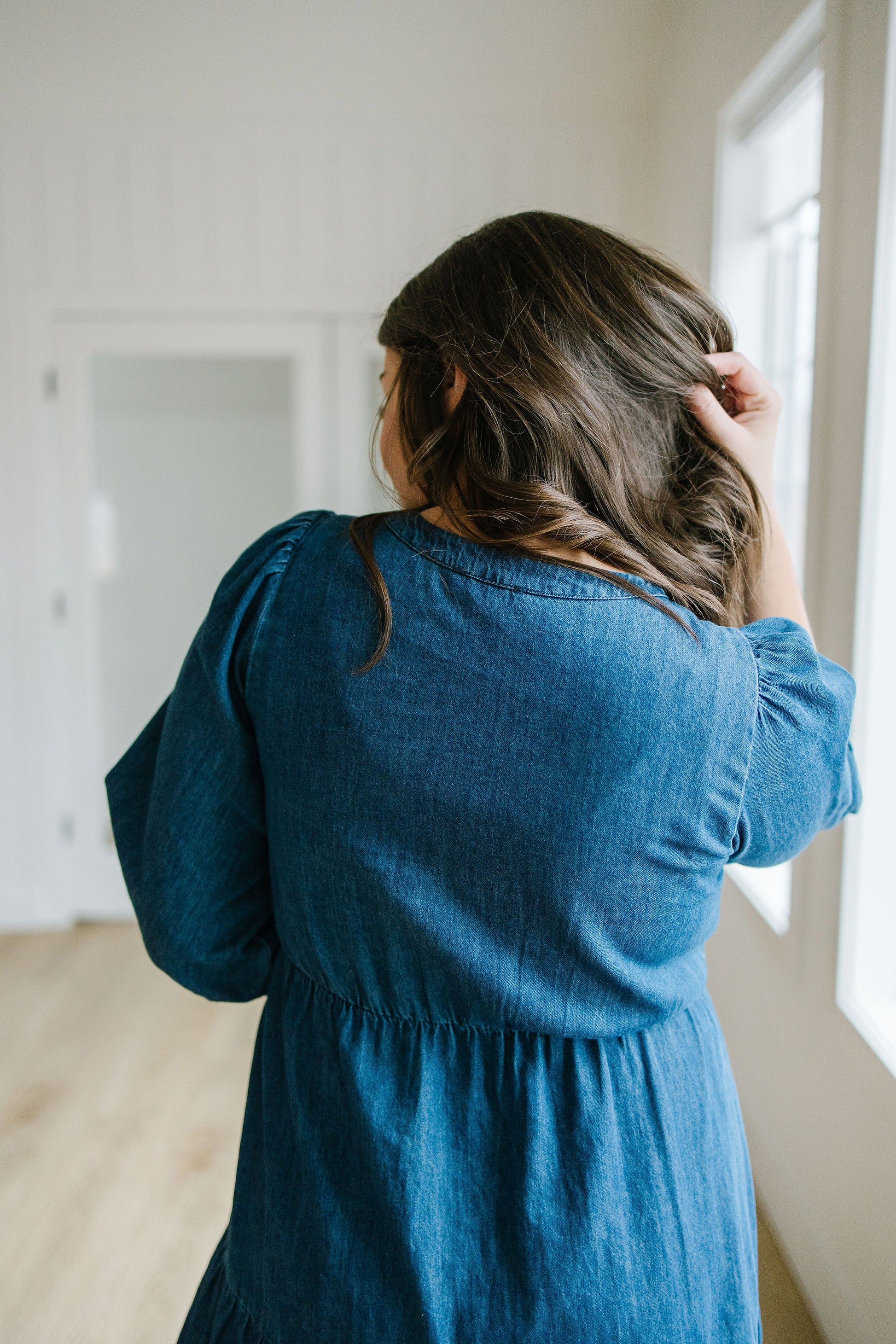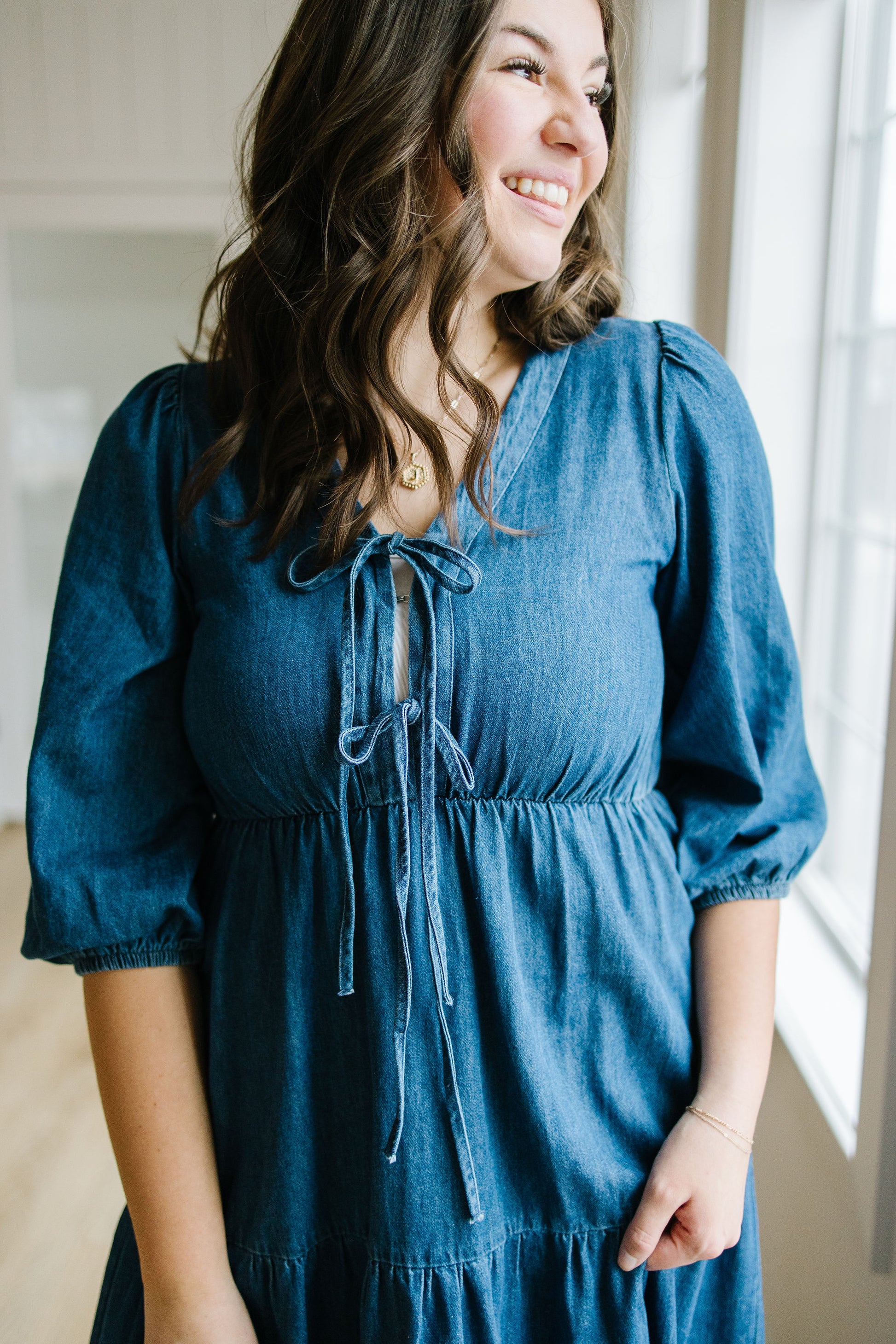 Tiered denim midi dress featuring a flattering double-tie front. Designed with breathable 3/4 sleeves and a flowy silhouette.
